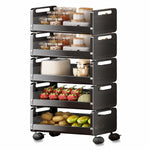 | Upgrade your kitchen with this durable 5-tier trolley crafted from rust-resistant carbon steel. Its breathable, ventilated design keeps fruits, vegetables, and spices fresh and neatly organized, while each tier offers ample space for multiple items. The smooth 360° rotating wheels, including two lockable ones, ensure effortless mobility and secure placement. Designed to save space, this versatile trolley is perfect not only for the kitchen but also for organizing essentials in the bedroom, living room, or study. |